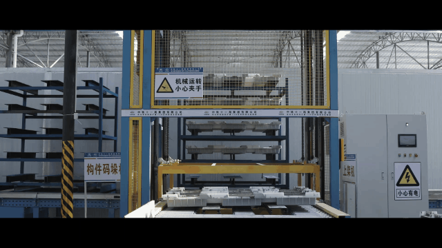 澆筑完成的混凝土托盤到達設定位置后,升降機內的伸縮貨叉伸出將托盤插起并升降,逐一將托盤放入5級貨架內,每個貨架堆滿完成后,由自動輸送線將貨架輸送至智能恒溫恒濕蒸養室養護。