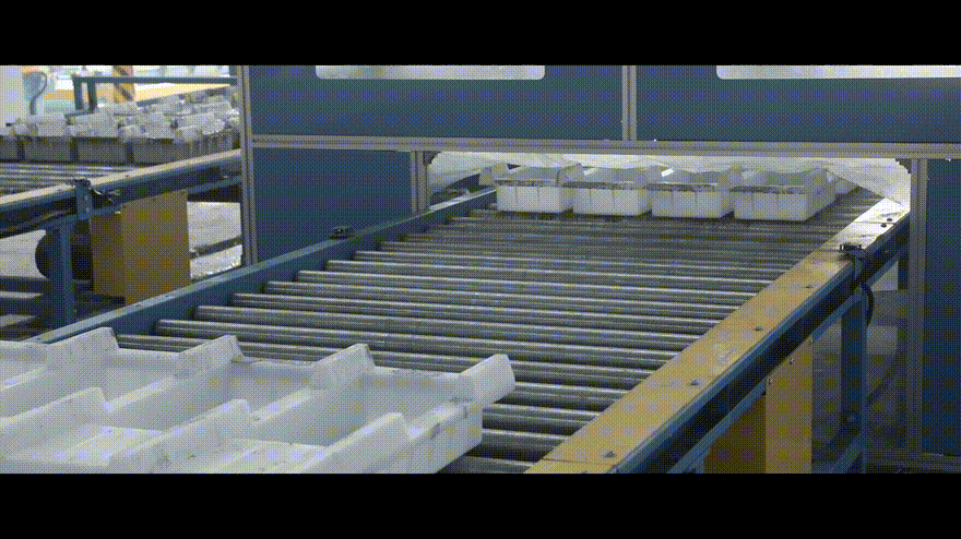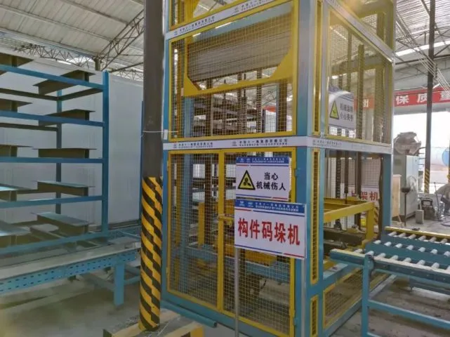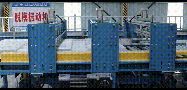 預制塊蒸養完成后,通過自動輸送線到達出庫升降機位置,升降機將成型的預制塊托盤插起并升降,逐一將5級貨架上托盤放入脫模輸送線,進入脫模區域。